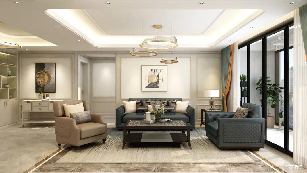 ▲室内的环形水晶吊灯,让空间明亮而高级,淡雅内敛的洛卡灰,在些许爱马仕橙的亮色点缀下,让空间色彩跳脱又灵动。飘窗设计,使光线毫无保留的散落空间,卧室通过自然光线与实木的洗礼,充满着温暖阳光的气息。